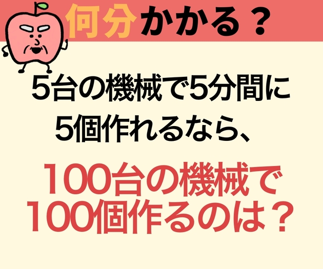 5台の機械で5分間に5個作れるとしたら、果たして100台の機械で100個作るのに何分かかるでしょうか?