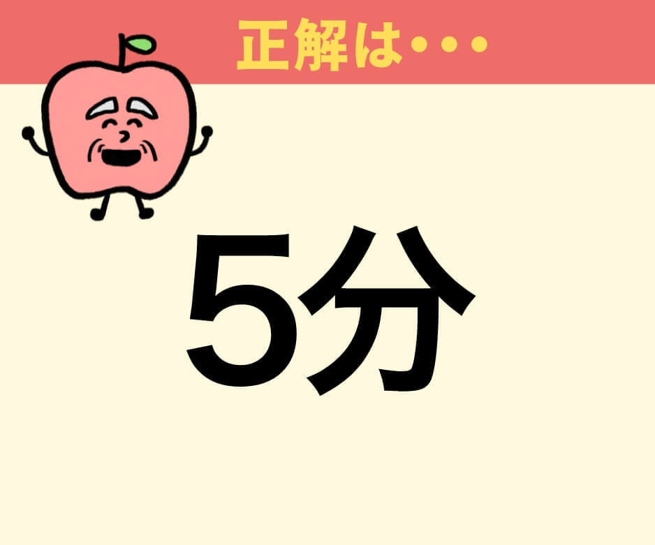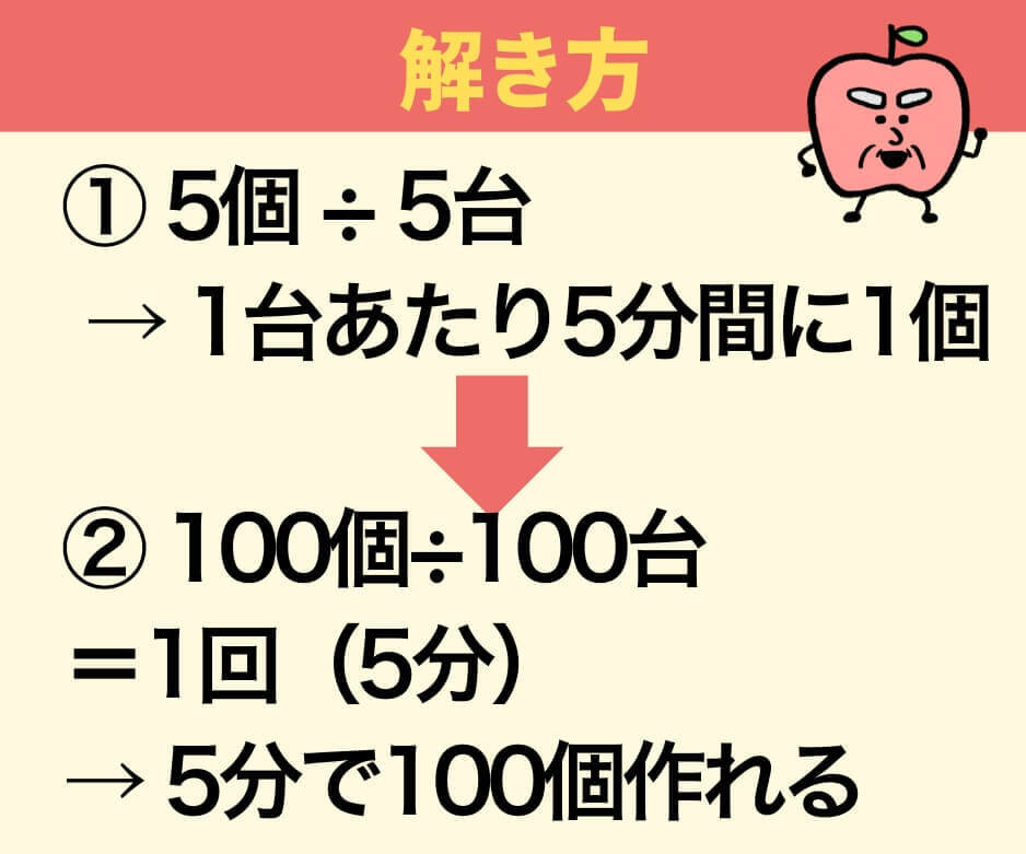 したがって、100台の機械で100個作るのに必要な時間は 5分 です!