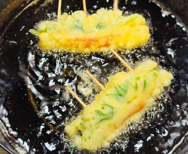 ちなみに、天ぷら粉が切り込み部分から中まで入ってしまうと火が通りにくい印象です。 天ぷら粉以外の材料は生で食べられるものですが、火の通り具合は確認するのがおすすめです。
