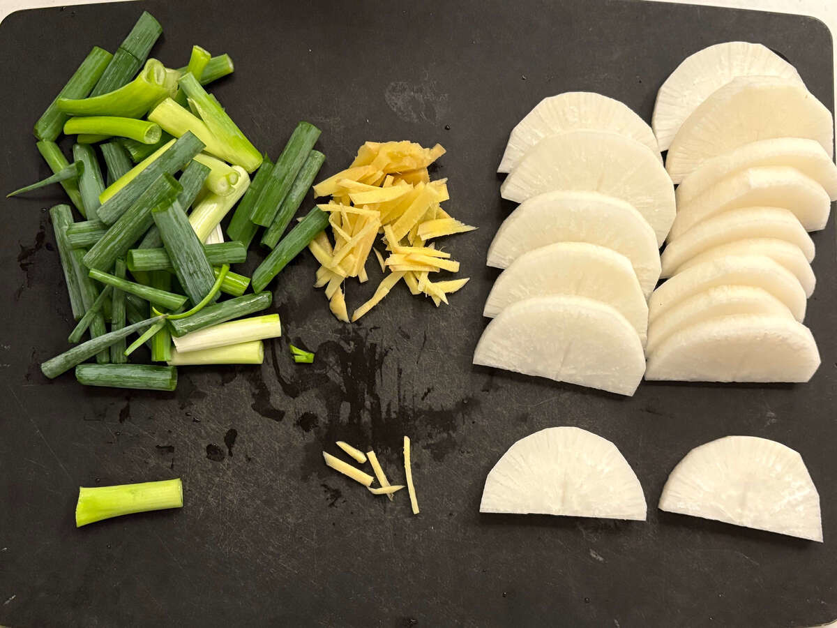生姜は3cm程度の長さで2mm角に切り、青ねぎは3cmの長さに切ります。