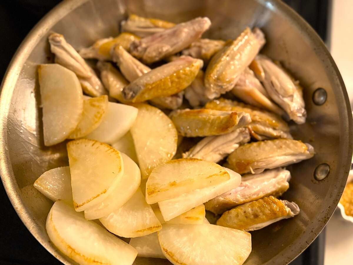 フライパンにサラダ油を入れて熱したら、手羽中は皮目を下にして入れ、さらに大根も入れて焼き色がしっかりとつくまで強火で焼きます。