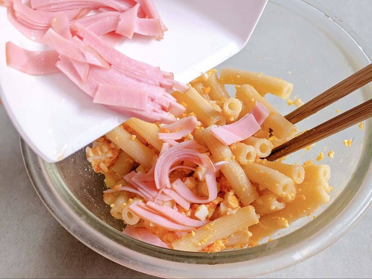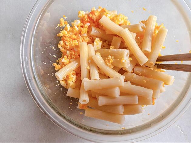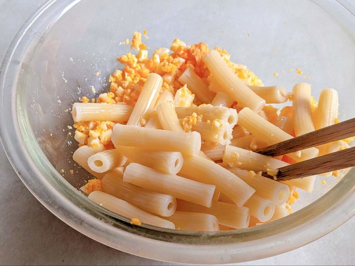 卵がマカロニに絡んで、いつもよりも黄色いビジュアル。