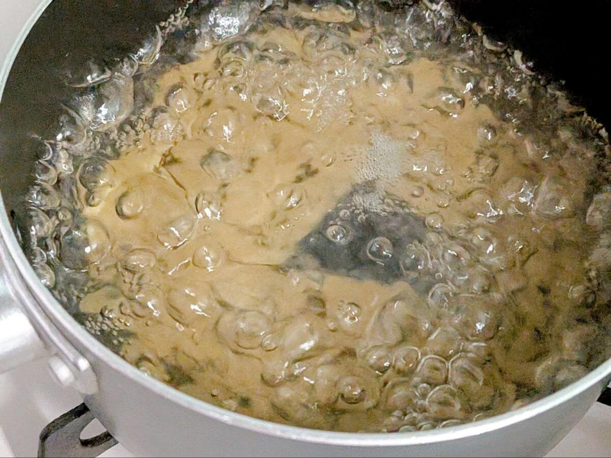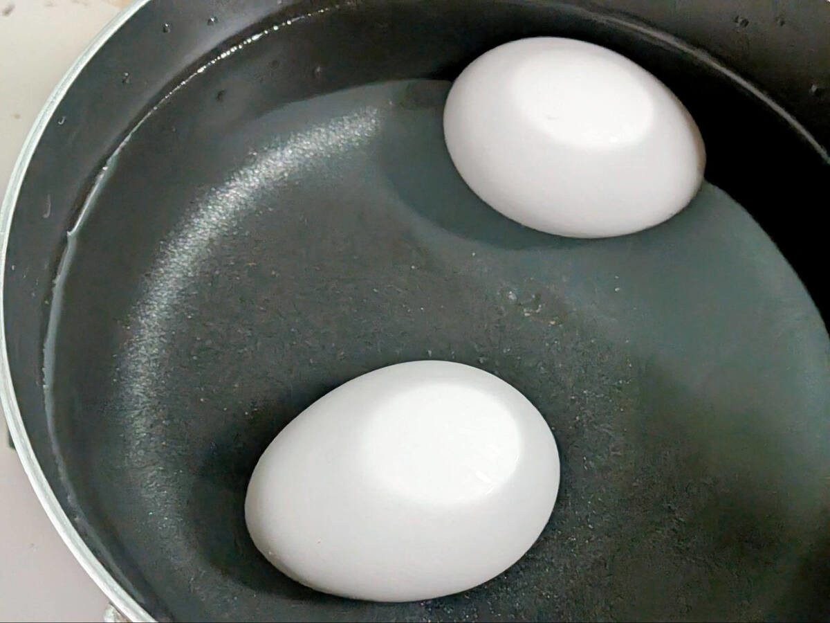 卵は水から茹でます。煮立ってから8分茹で、水にとって冷ましてください。