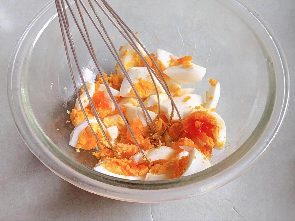 卵の殻をむき、粗みじん切りにしたら、ボウルに入れて泡立て器でつぶします。