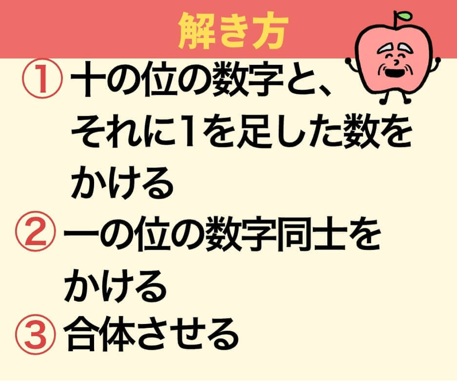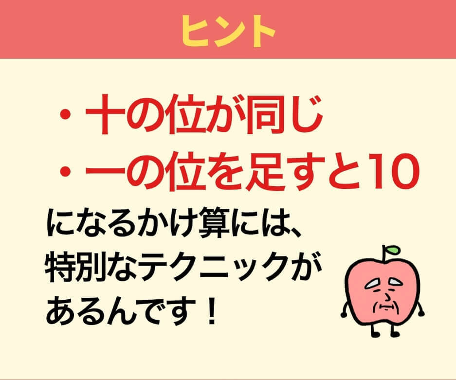 インド式計算にはいくつか方法がありますが、今回使うのは「十の位が同じで、一の位を足すと10になるかけ算」!