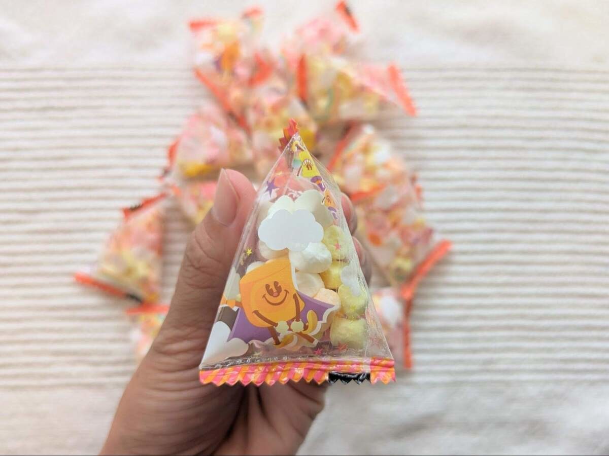 お菓子を取るとき、つい大きいサイズを選びたくなりますよね。こちらはテトラポット型で6種類、袋型が3種類なので、形で選んでも中身は分かりません。