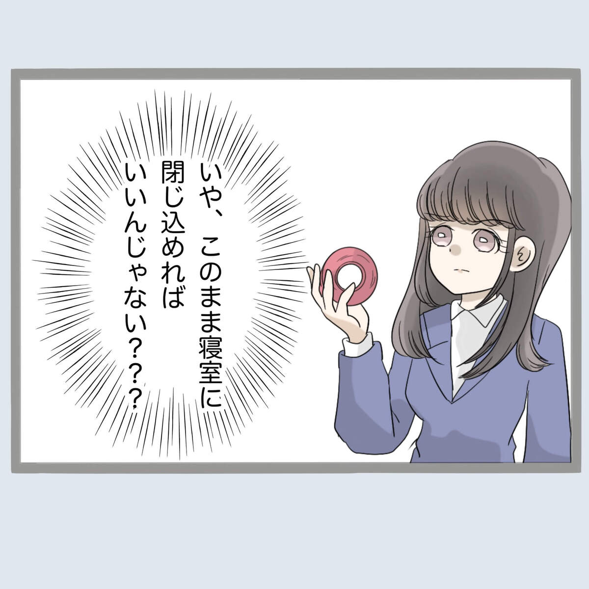 思わぬ展開に心の準備ができておらず、パニックになるナギサ。なにか武器になるものを…と、咄嗟にガムテープを掴んで2階へ(笑)。