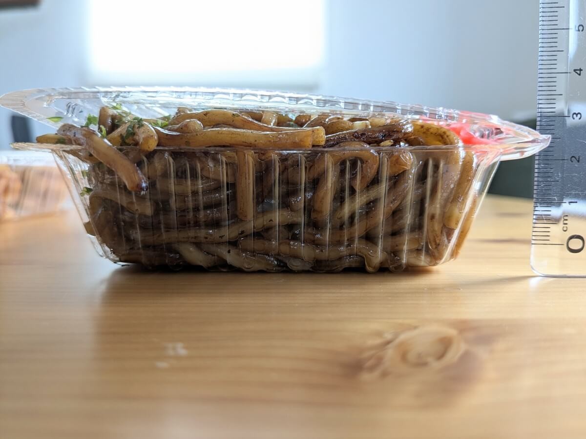 パックからあふれんばかりの焼きそば。こちらの「普通盛り」は、他店の「大盛り」並みのボリューム。少食の方はご注意を。