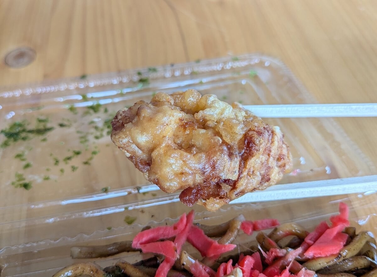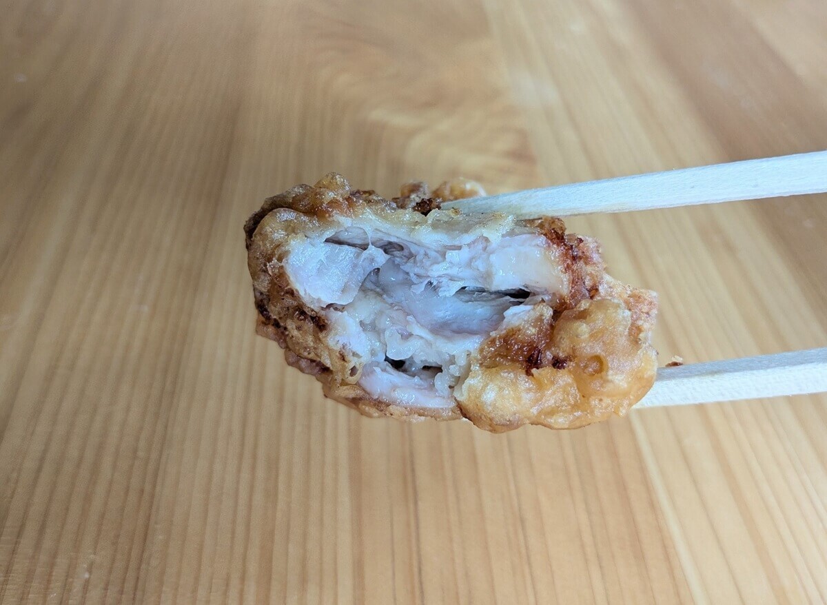 購入から30分以上経っても衣はサックリ、中はジューシー。 噛むたびに肉の旨味が広がり、ほどよい塩加減が焼きそばとも好相性。