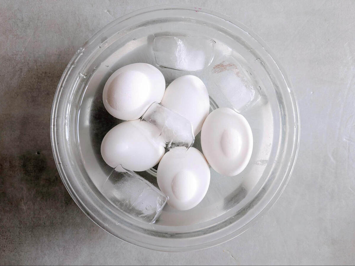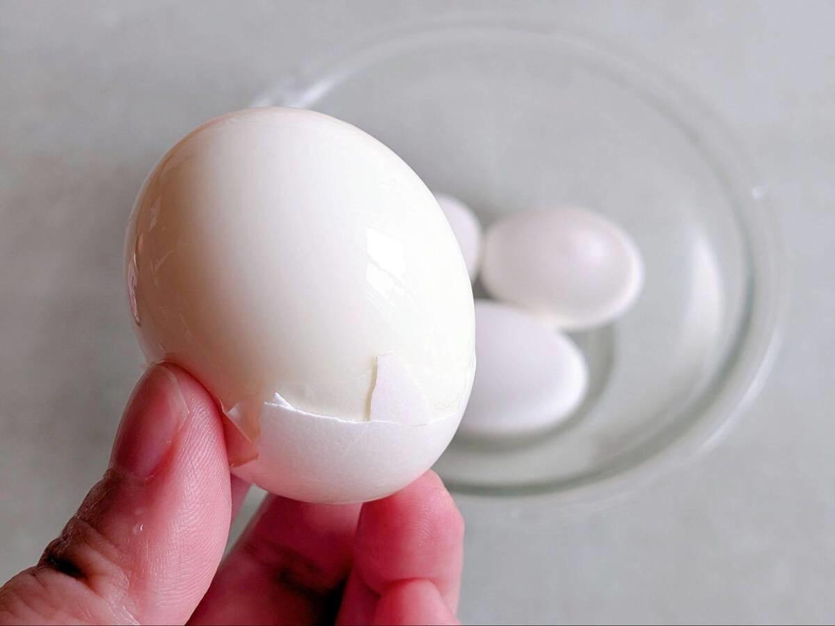 茹でた卵を冷たい水(分量外)で冷ましましょう。