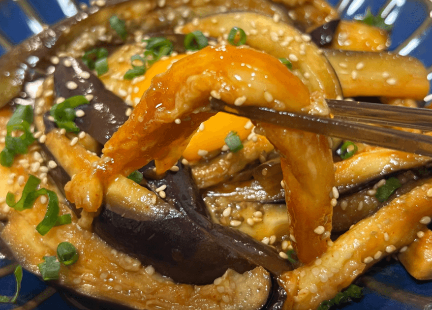 なすの果肉の部分はスポンジのようにコチュジャンだれがしみ込んでいてやわらかく、逆に皮の部分は歯ごたえがあって食べていて楽しい!