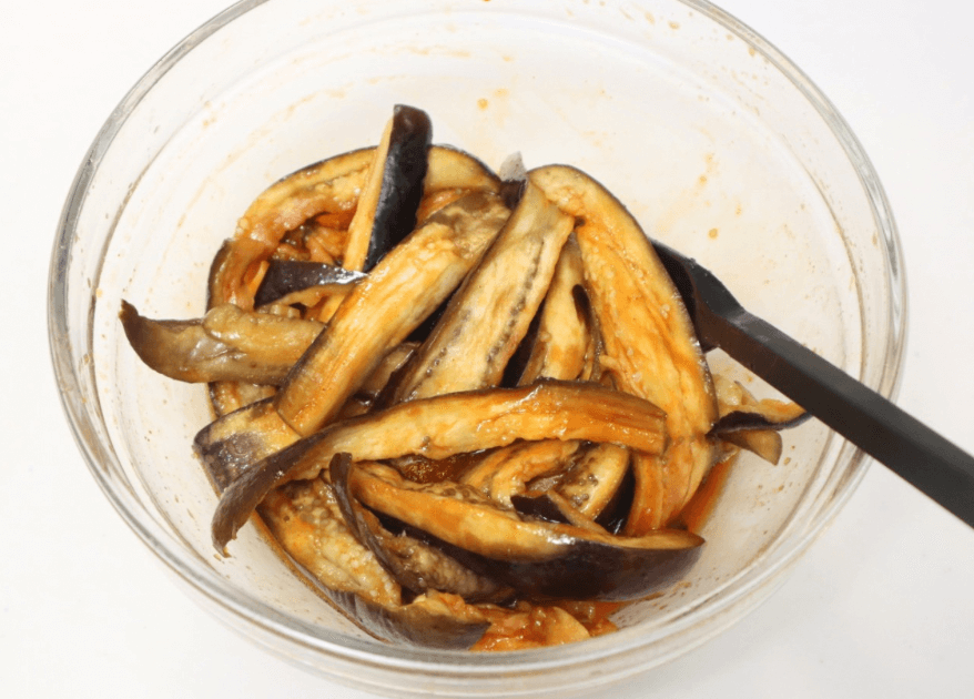 絡めながら混ぜていくと、だんだんなすにたれがしみ込んで、よりじゅわっとした食感になるんです♡