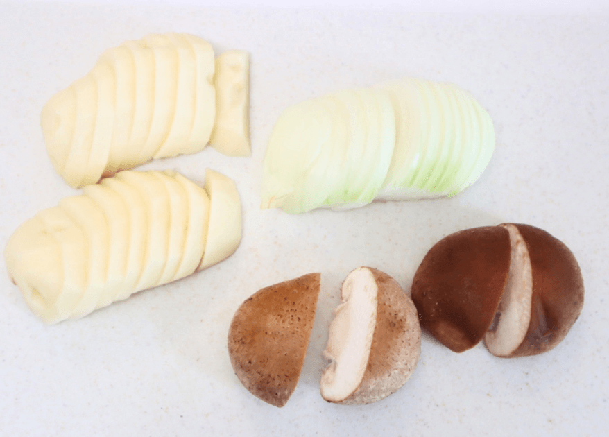 じゃがいもは皮をむいて薄い半月切り、玉ねぎは縦に薄切り、生椎茸は軸を取って斜め半分に切りましょう!
