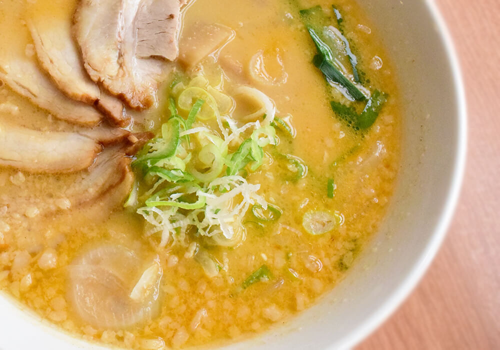 味噌と豚骨の旨みを同時に楽しめる一杯。背脂が浮いており、見た目の印象だけでは少しこってりしていそうに見えます。チャーシューが5枚も入っているのは嬉しいポイント。