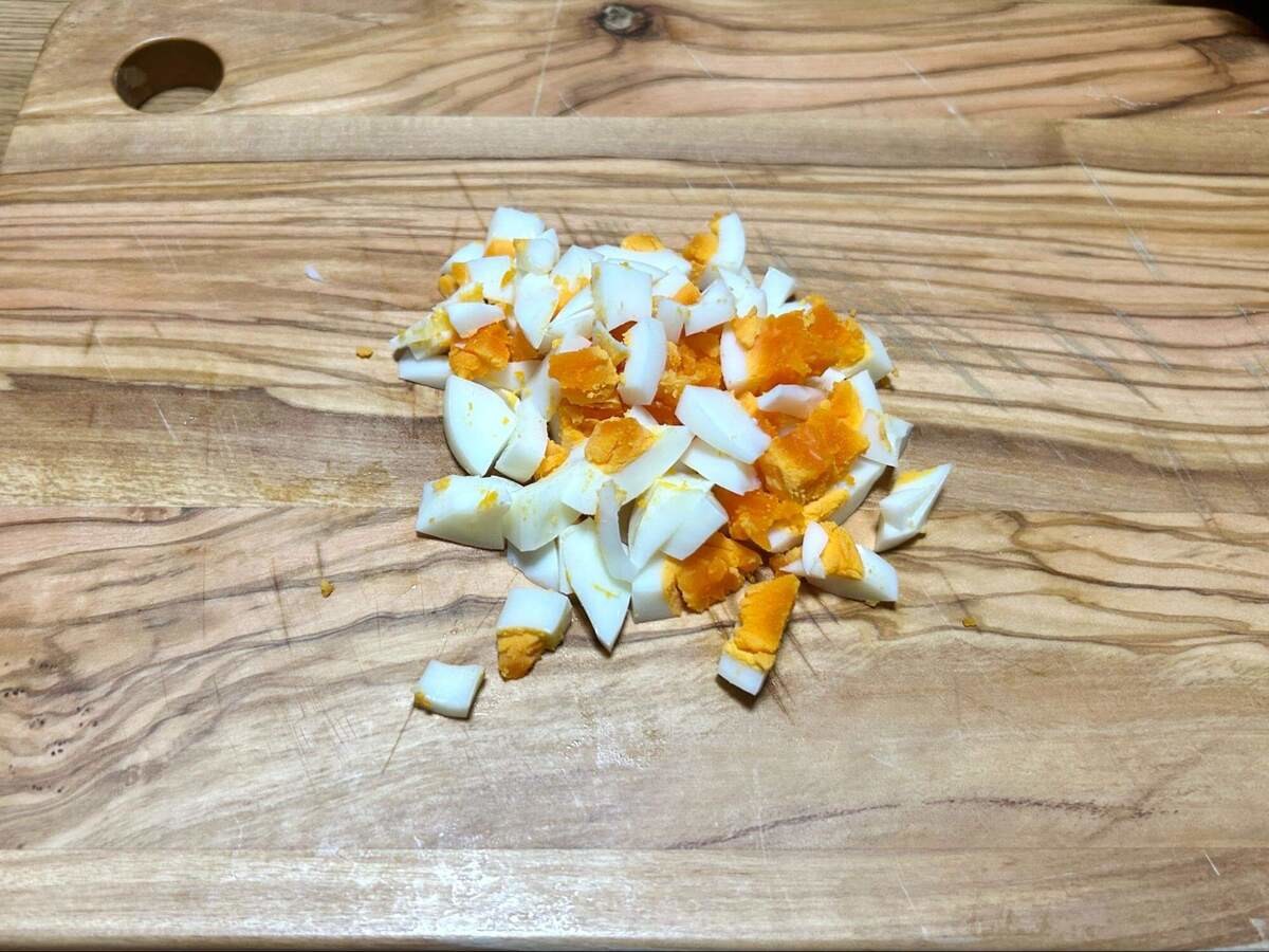 続いて、ゆで卵を作り、みじん切りにします。