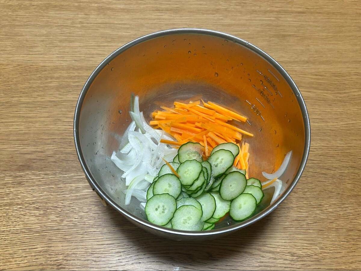 人参は千切り、玉ねぎときゅうりは薄切りにします。