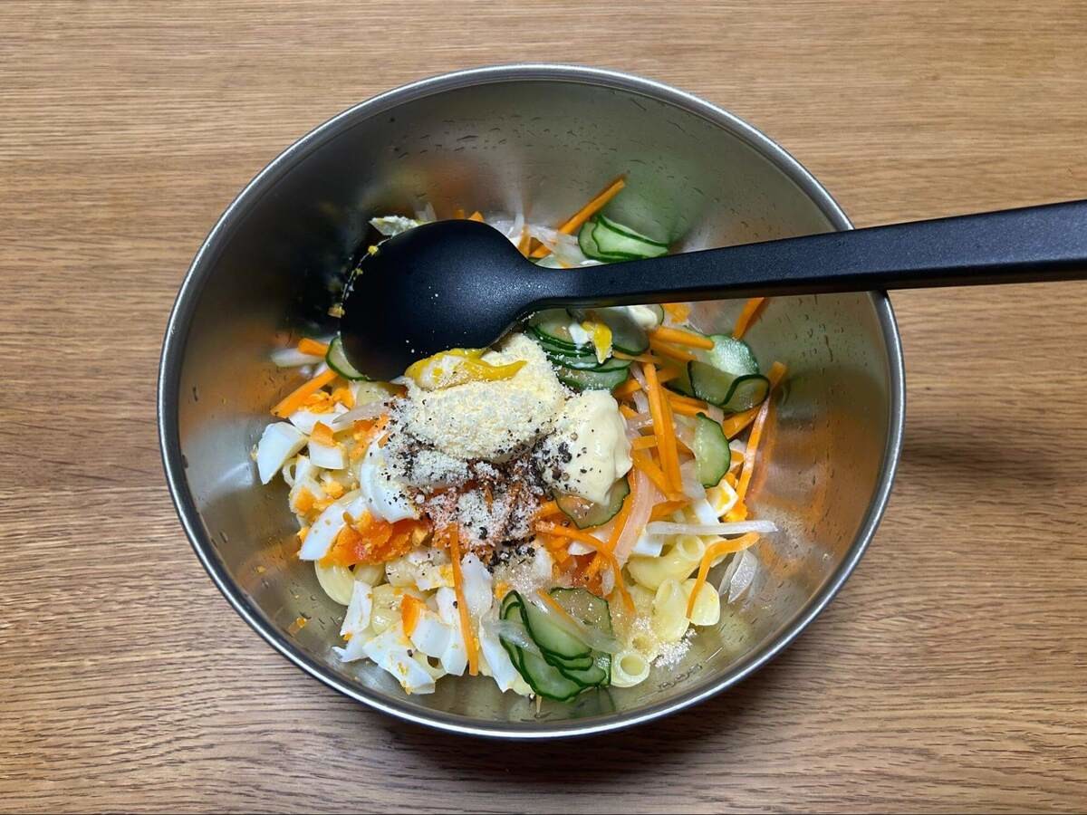 作り方⑤マカロニと野菜、卵、調味料を合わせる