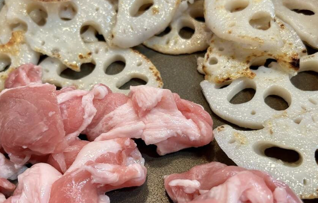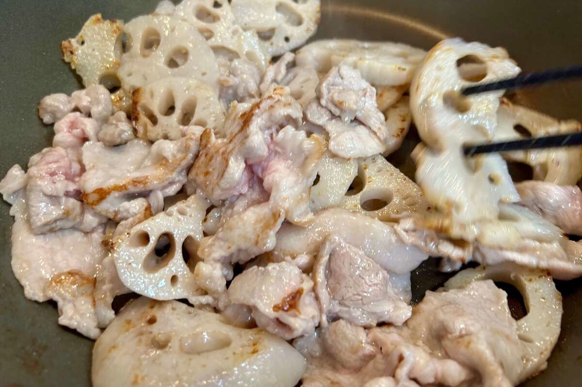 裏返した蓮根の裏面が軽く色付いてきたら、豚こま肉を入れます。