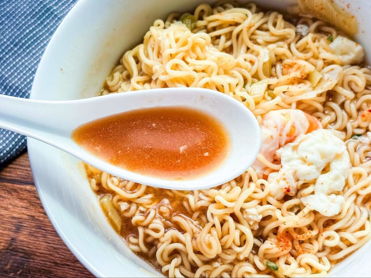 麺をゆでてから2分ほど経ったら火を止め、粉末スープを加えてよく混ぜます。