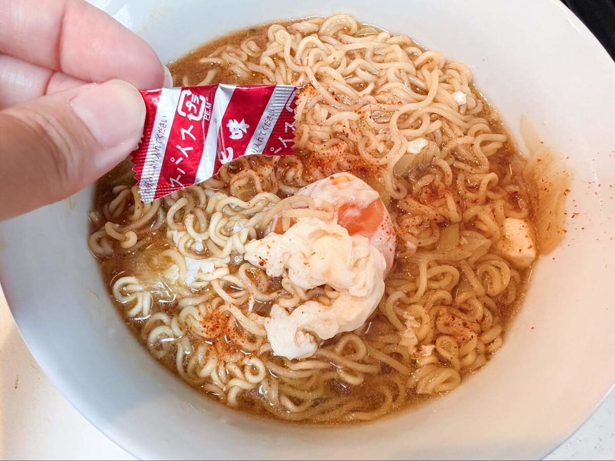 ラーメンを器に盛り、仕上げに七味スパイスをふりかければ完成です。