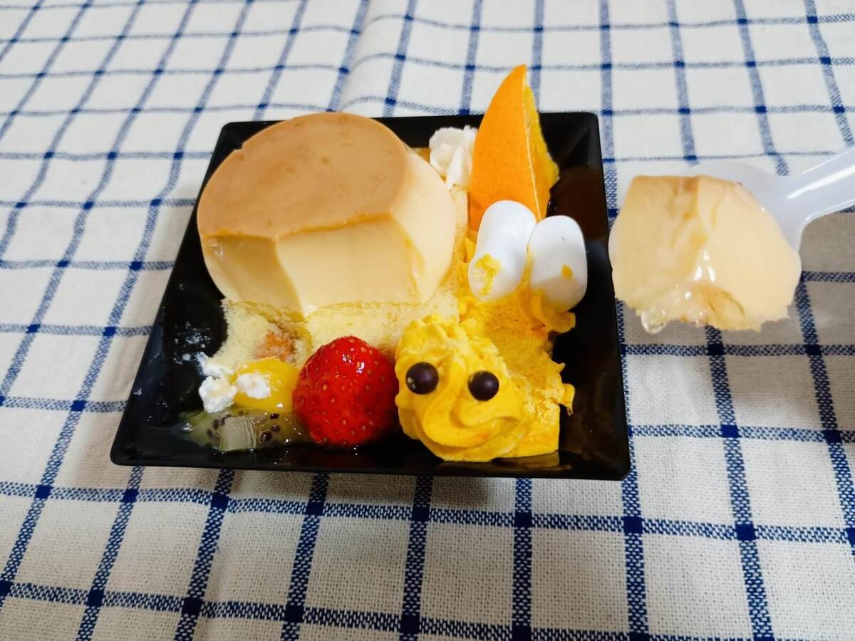 プリンとスポンジ部分を食べ進めていくと、途中で少し飽きてしまうかもしれないので、クリームや果物と交互で味わうのがいいかもしれません。