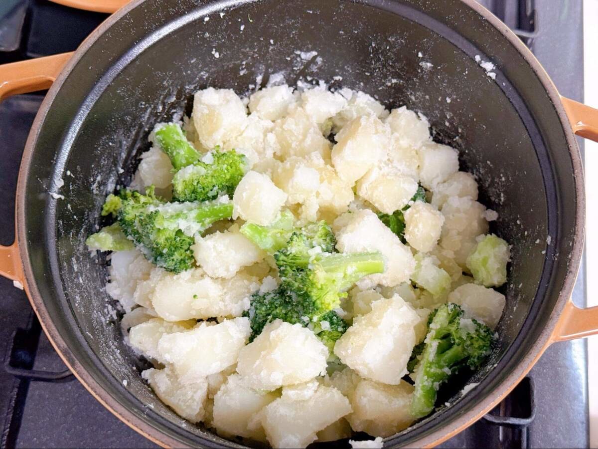 ②でザルにあげたじゃがいもとブロッコリーを、空になった鍋に再び戻します。