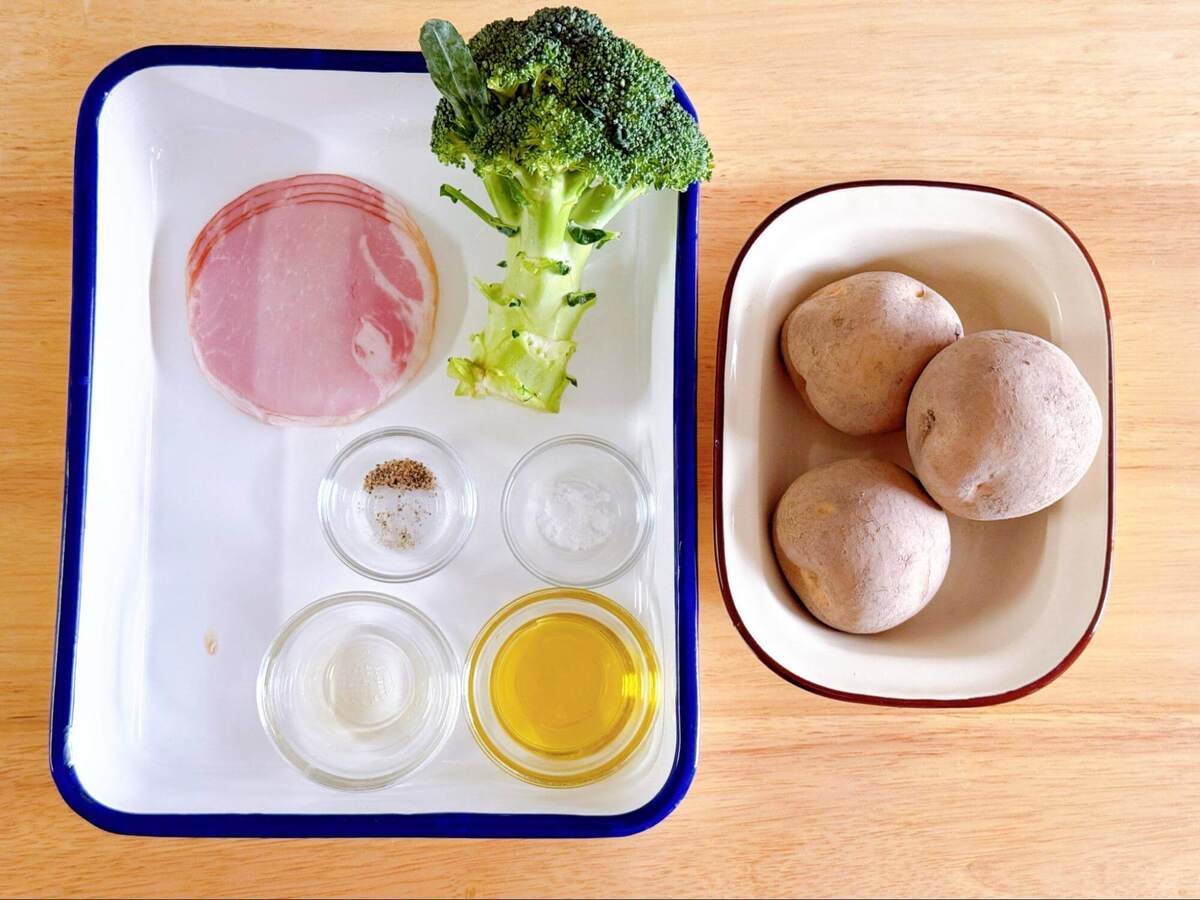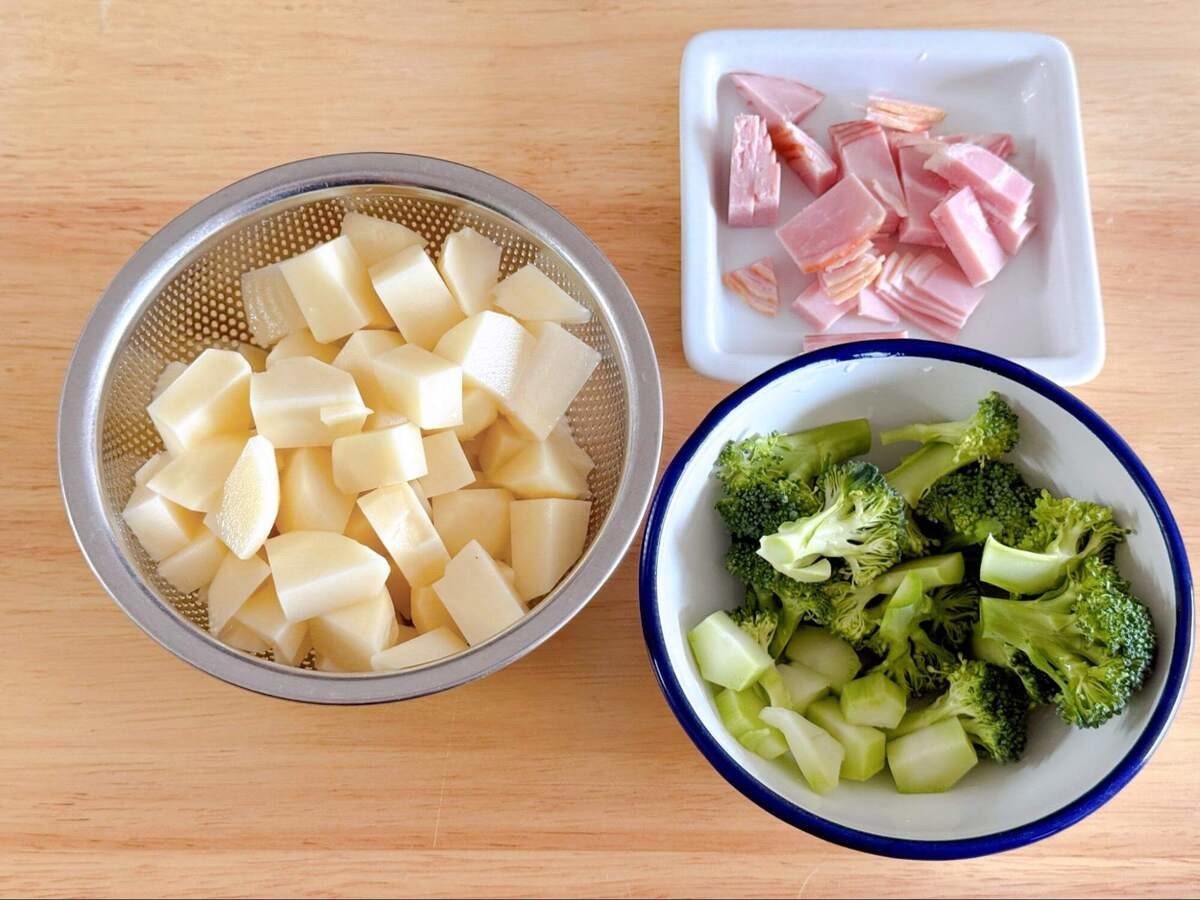 じゃがいもは皮をむいてひと口大に、ブロッコリーは小房に分け、茎は皮をむいて薄切りに、ハムは食べやすい大きさに切っておきます。
