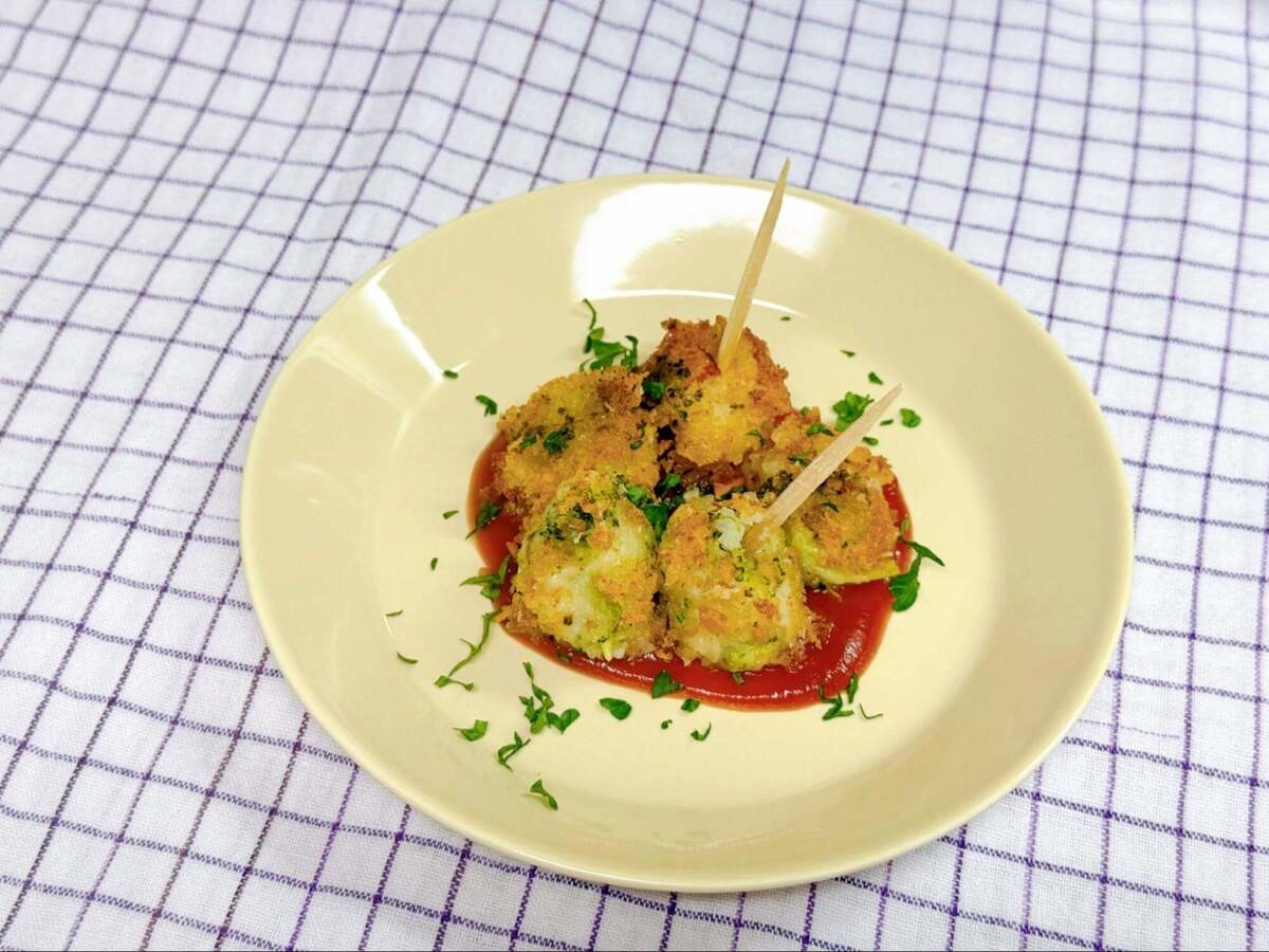小さく丸めたポテブロサラダにパン粉をまぶして、少ない油でカリっと揚げ焼きに。