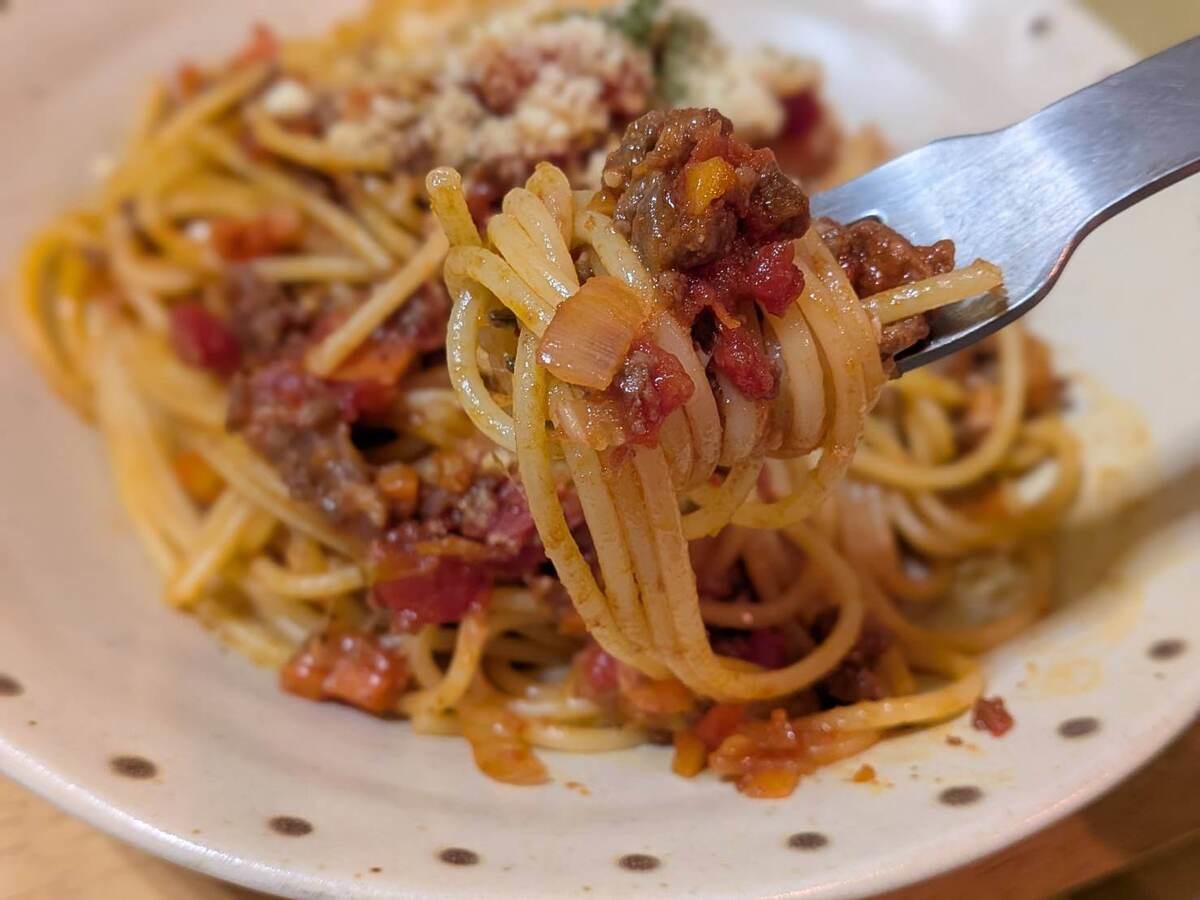 まさに“肉の存在感MAX”!しっかり煮込まれていて、酸味よりもコクと甘みが強く、今までのミートソースは何だったの~!?って感じです。もう元には戻れないかも……。