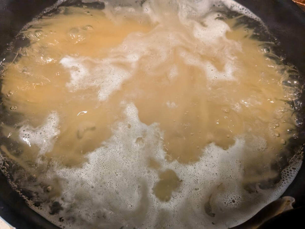 別のフライパンに⑤のミートソース180g(今回は4人分なので倍量)と⑥のゆで汁適量を入れて弱火でゆっくり温め、塩、コショウで味を調えます。