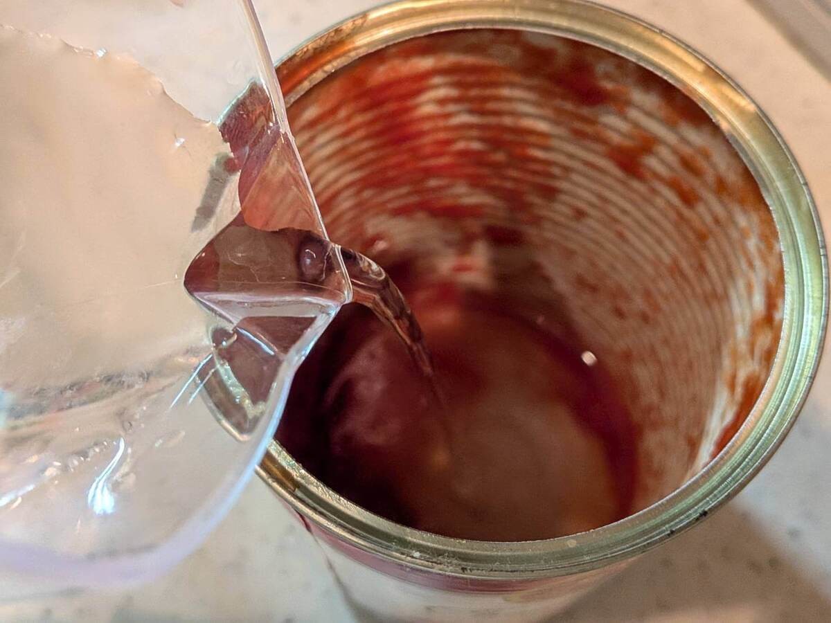 缶にこびりついたトマトも無駄にしたくない(笑)。分量の水をまずはトマト缶に入れて、ゆすぐようにして入れました。
