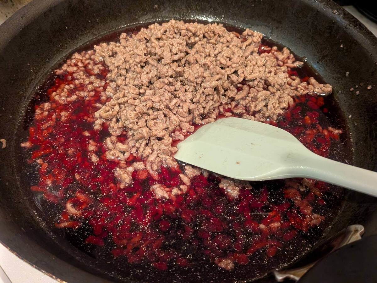 新たにフライパンを用意し、ひき肉を入れて炒めます。