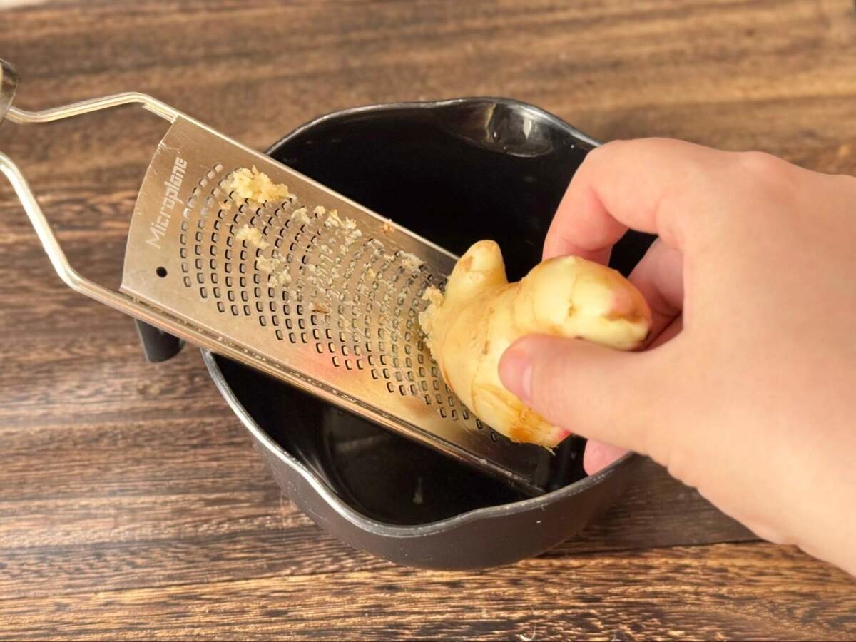 新生姜は軽く水で洗い、皮付きのまますりおろします。