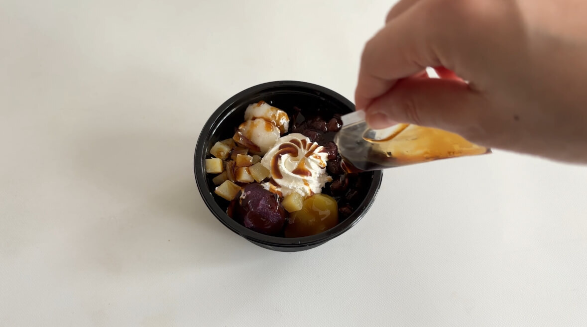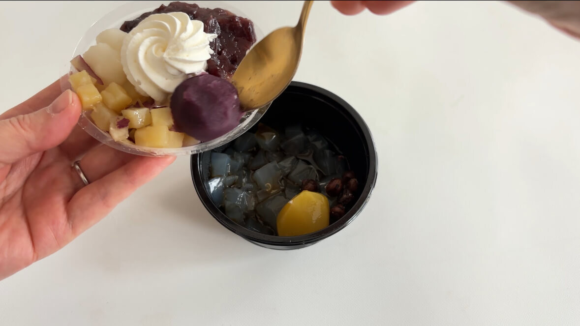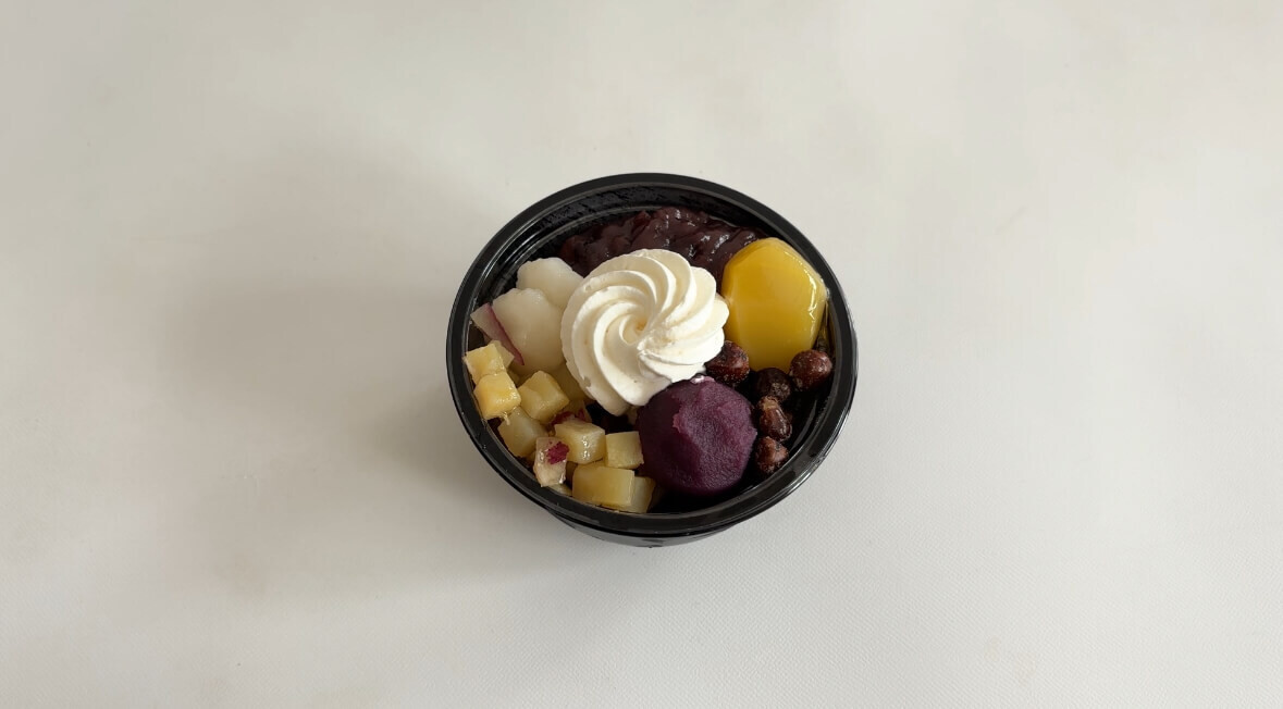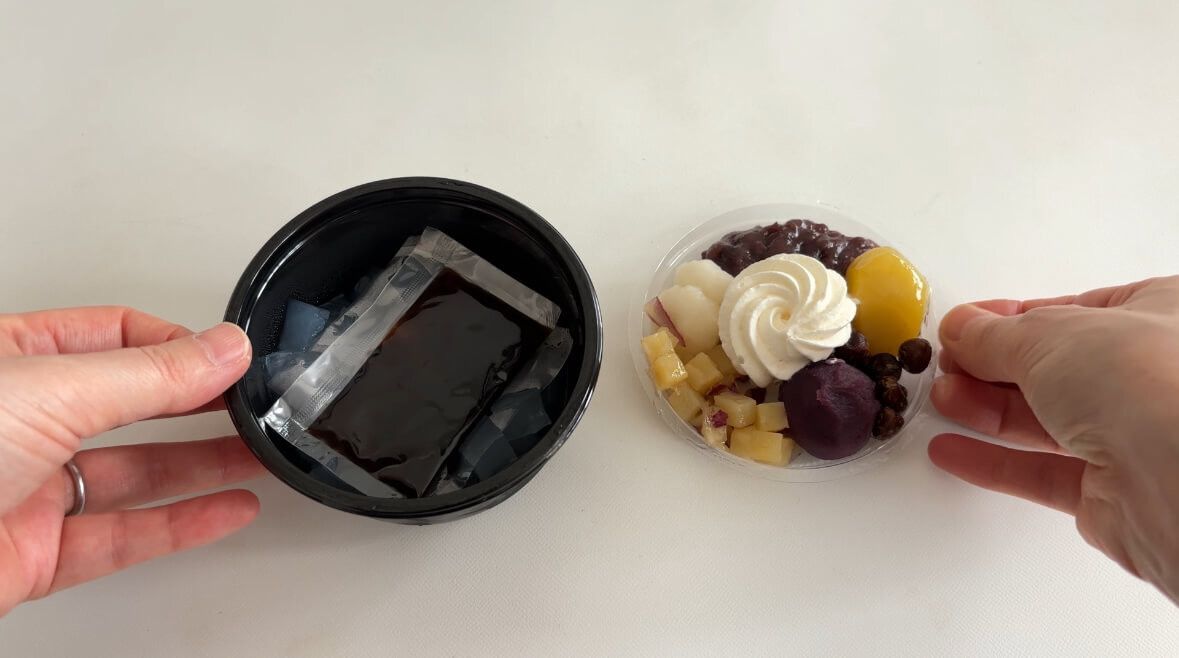 容器が2段構造になっていて、下の段に寒天と別添えの黒蜜、上段にトッピングの紅芋・紅はるか・栗・塩豆・白玉風団子・ホイップクリームが入っています。