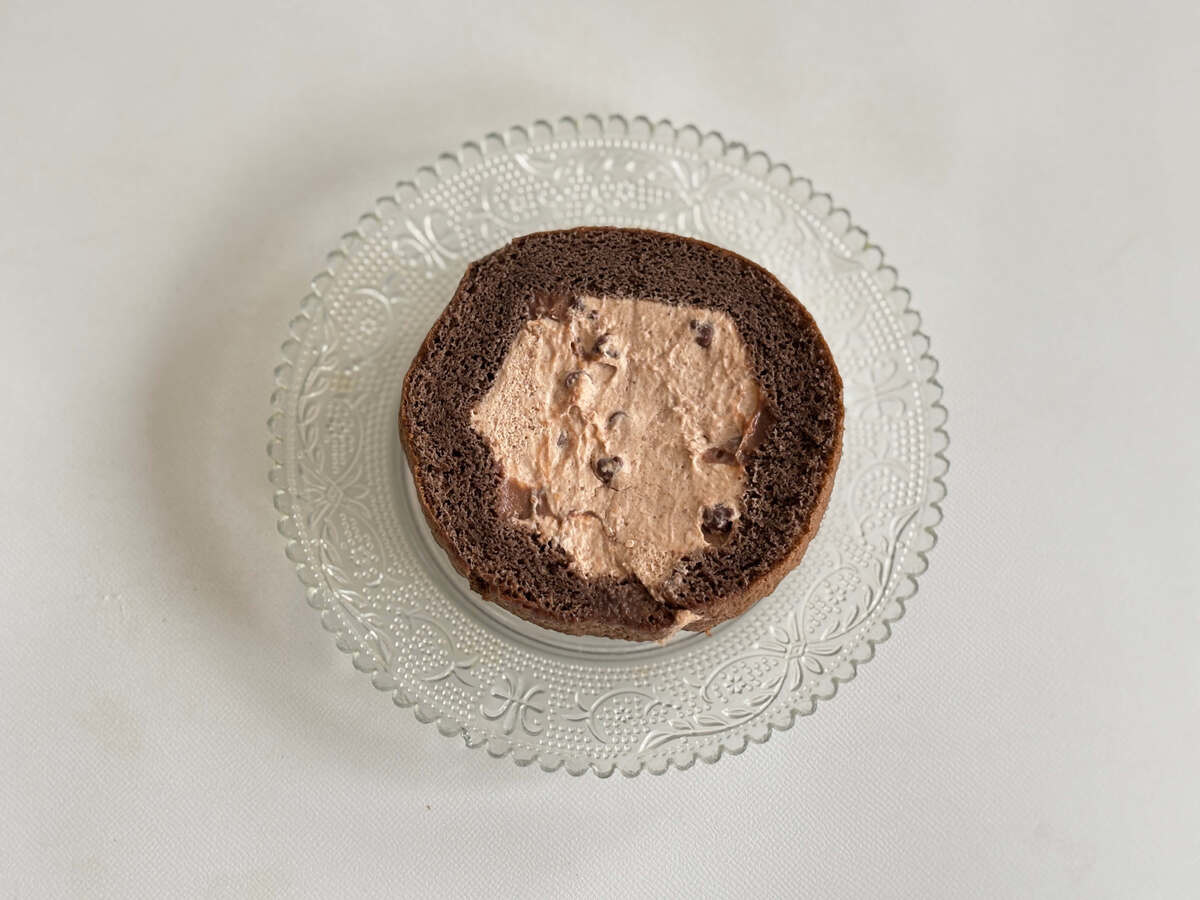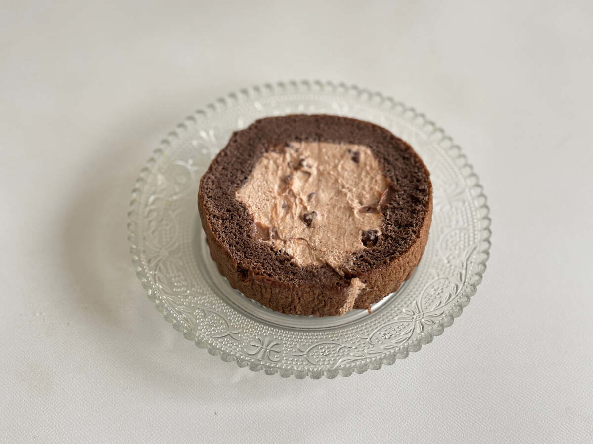 ふわふわのココアスポンジで、チョコキャラメル風味のホイップとチョコカスタードをくるっと巻いたロールケーキです。