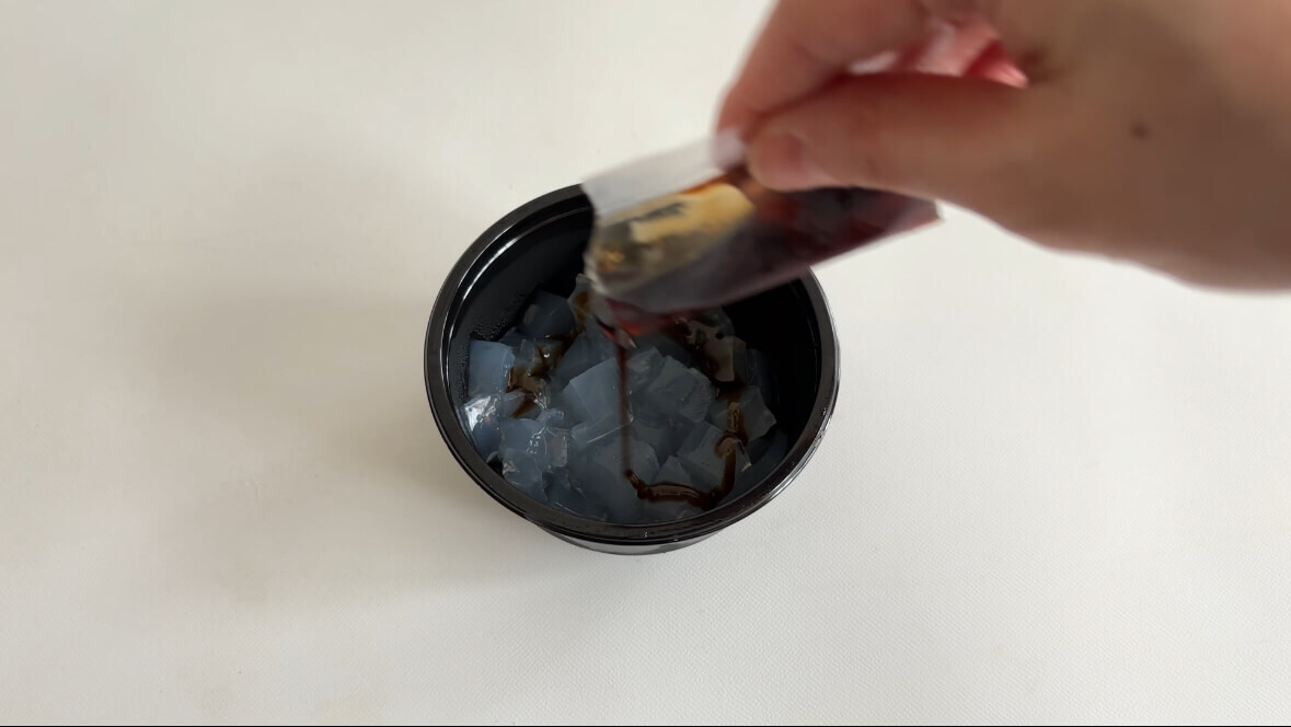 まずは、寒天に黒蜜を3分の2かけて……