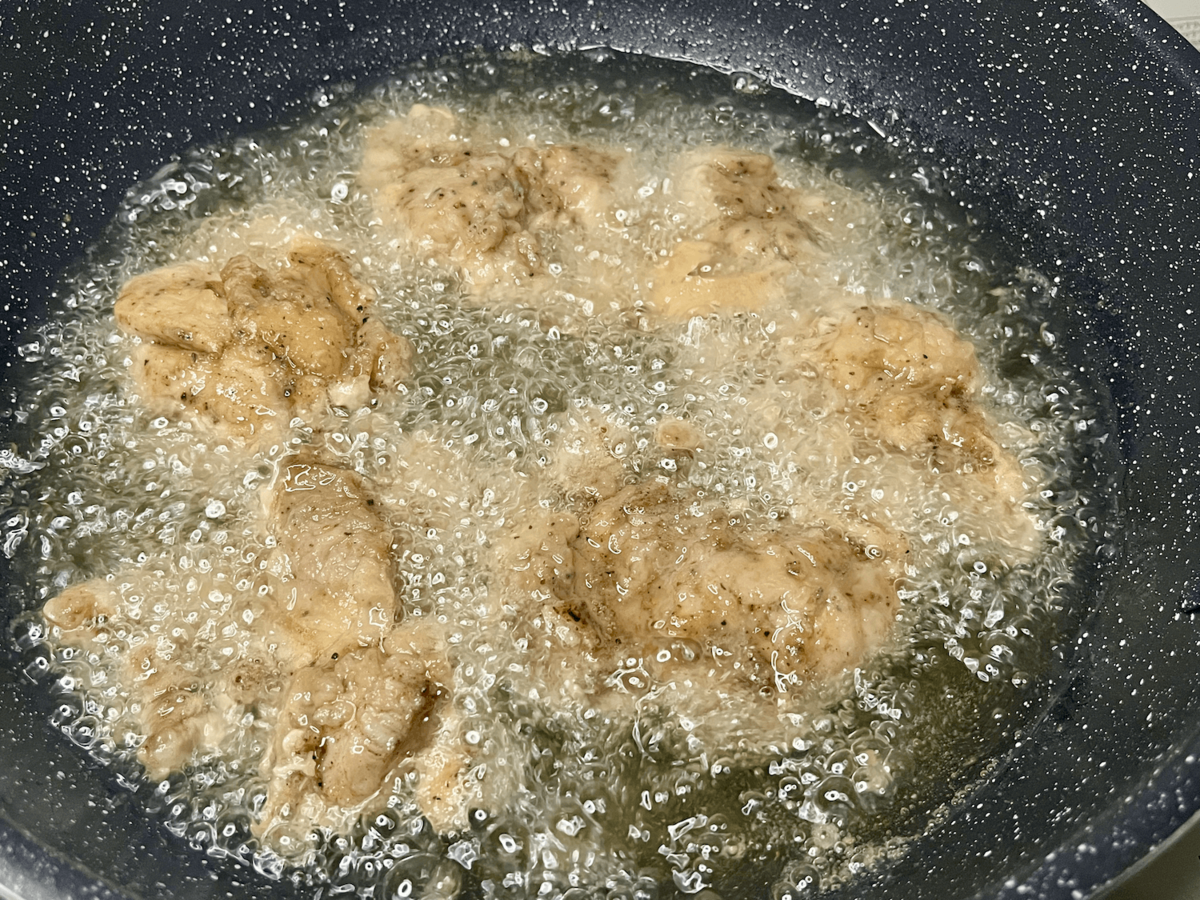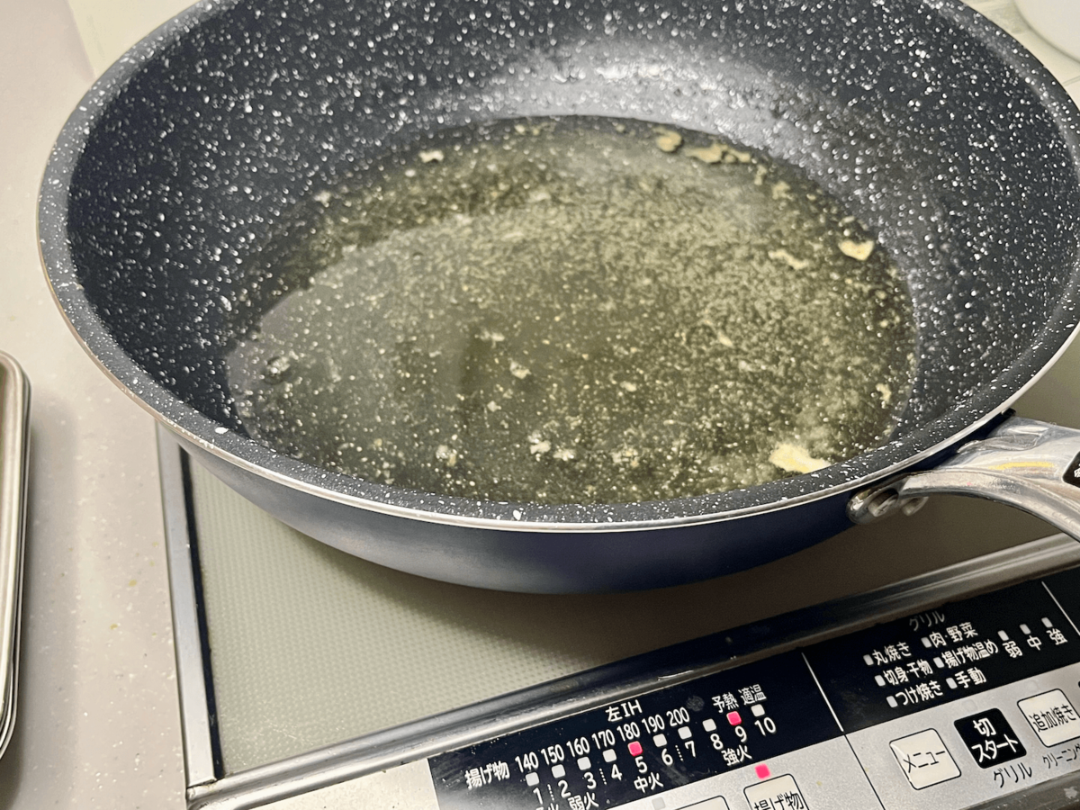 フライパンに油を入れ、温度は130度を少し下回るくらいをキープするようにします。