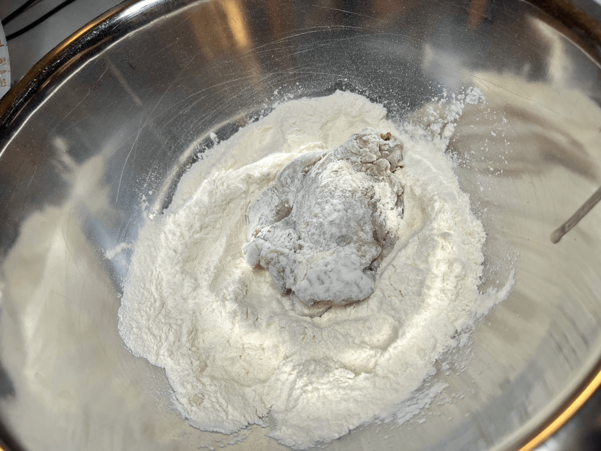 皮を伸ばすように広げながら、強力粉(衣用)をつけます。