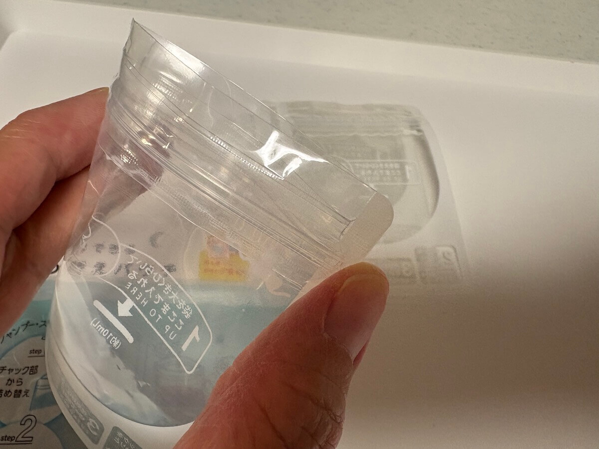 似た商品で、フタを開け閉めして詰め替えるものもありますが、中身を出し切ることが難しいんです。こちらはパウチ状のため、絞り出して使い切ることができます。