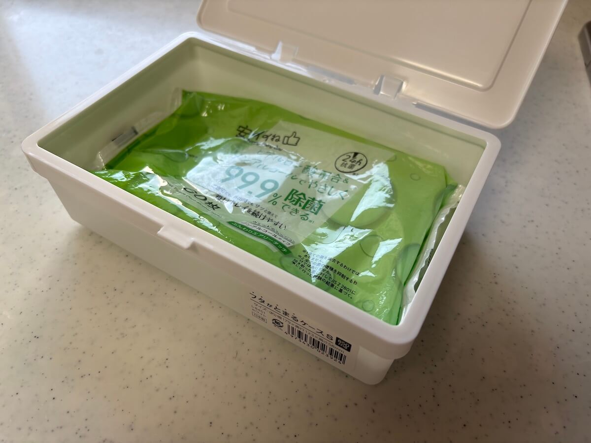 袋のままだと数週間で乾燥してしまうこともありますが、このケースならフタがしっかり閉まり、最後まで湿ったまま使い切れるんです。