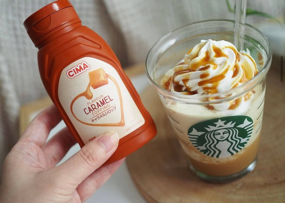 同じく業務スーパー購入品のアマンディホイップを絞ったドリンクに、キャラメルシロップをかけるとカフェ風ドリンクが簡単に作れますよ。
