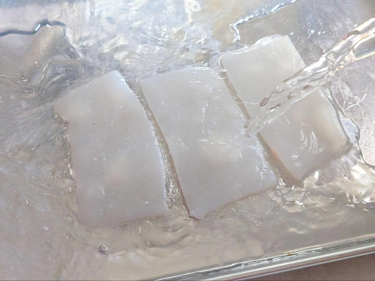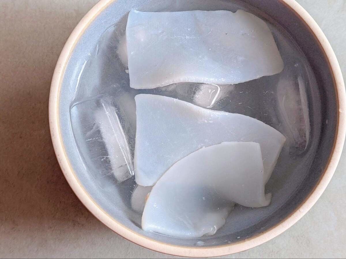 イカに熱湯を注ぎ、すぐに氷水で締めてください。