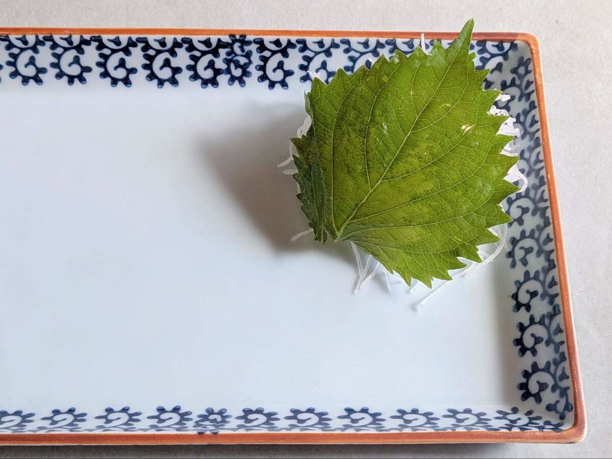 その上に大葉をのせ、ここに刺身を盛り付けることで立体感が出ますよ!