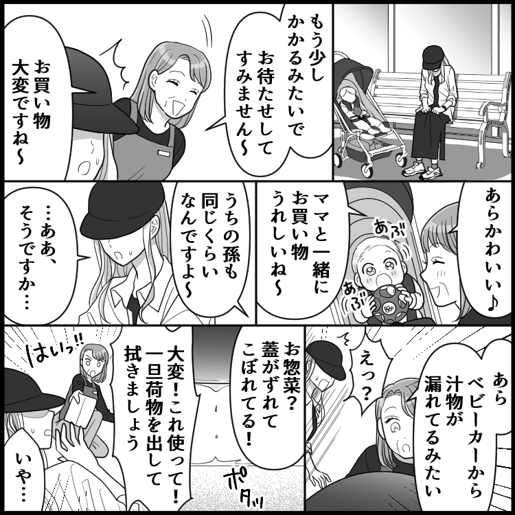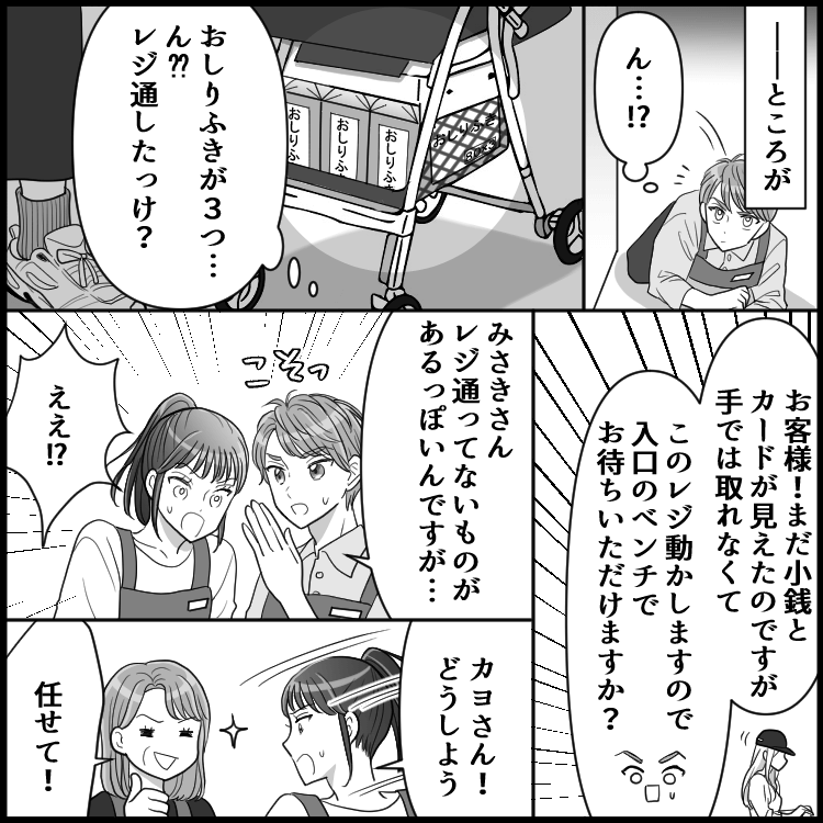 今回は漫画担当の友人の実話をもとに、ドラッグストアで起こった若いママとのひと騒動をマンガにしてみました。なんと、大人の万引きが発覚して大騒動に!