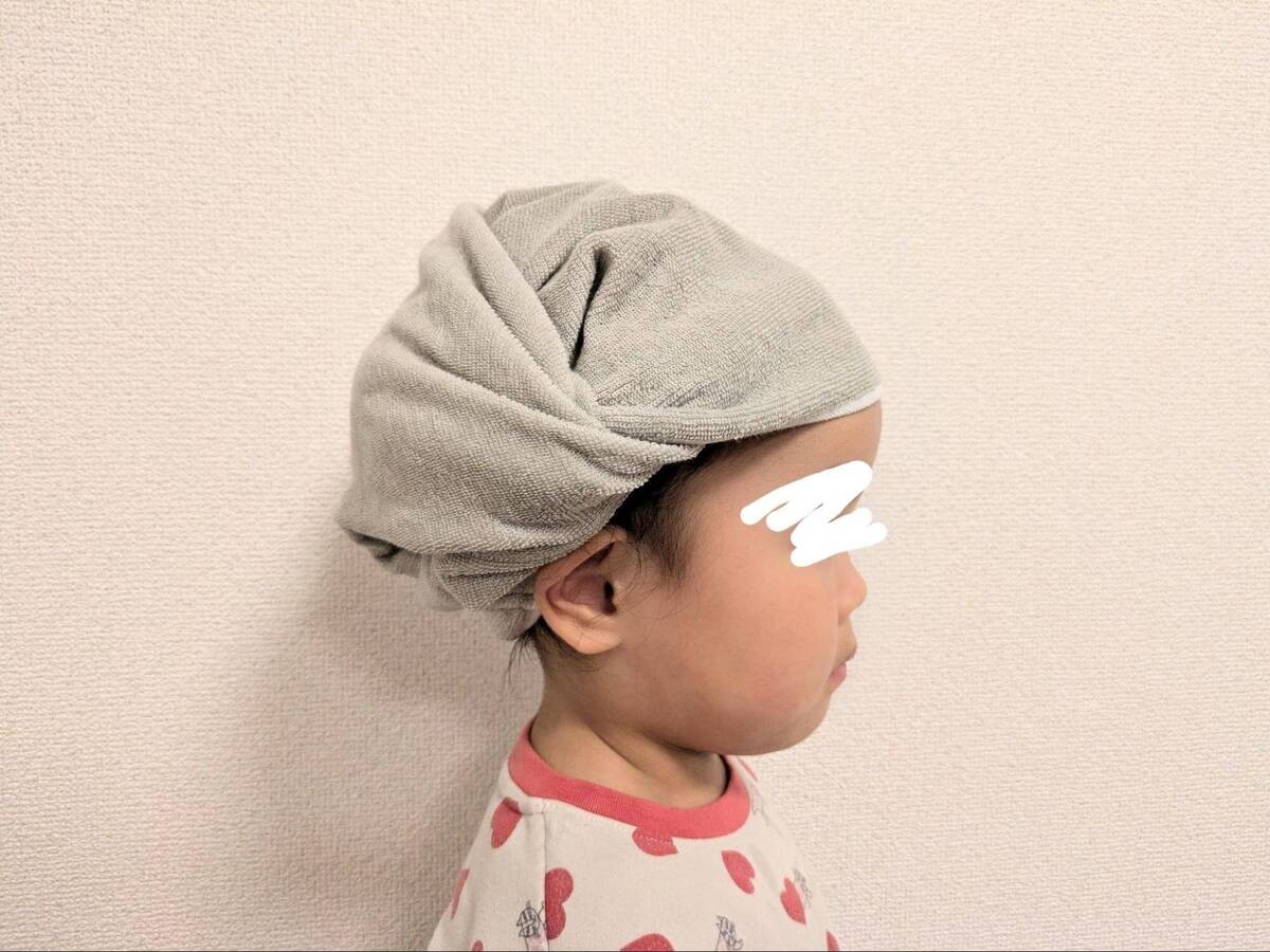 子どもが使うにはちょっぴり大きめなので、毛先の方からターバンをくるくると巻き、耳の横あたりに折り込んでいます。これでずれることはありません。
