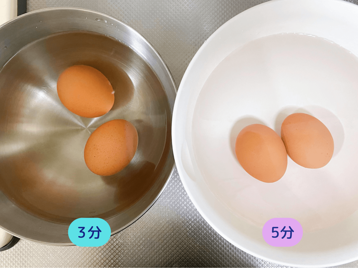 取り出すタイミングで卵のかたさが大きく変わるので、3分の時点で半分を取り出し、残りはそのまま5分まで置いてかたさを比べてみました。