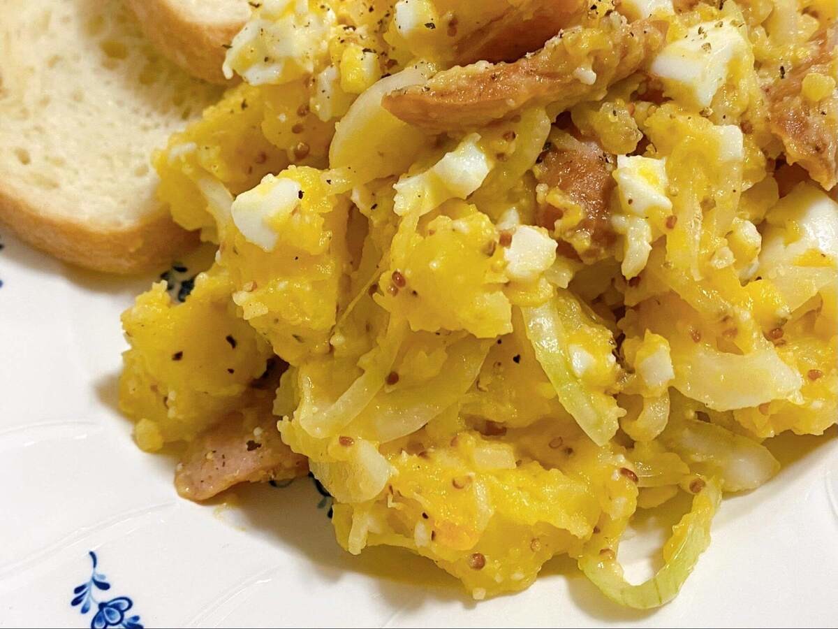 そこに、軽く潰したゆで卵・玉ねぎ・ソーセージを入れてさっと混ぜます。
