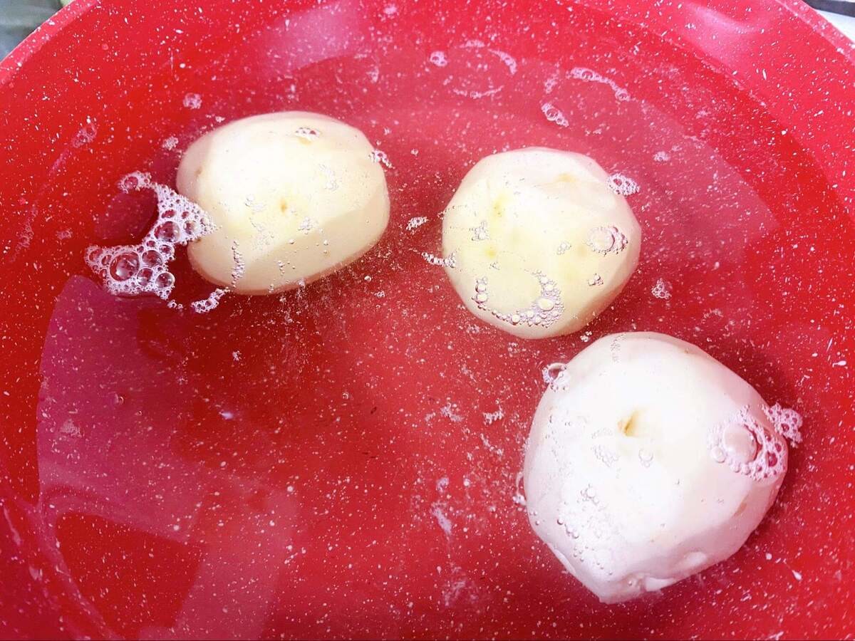 じゃがいもをゆでます。特に記載がなかったので皮をむいてから、丸ごと水に入れました。
