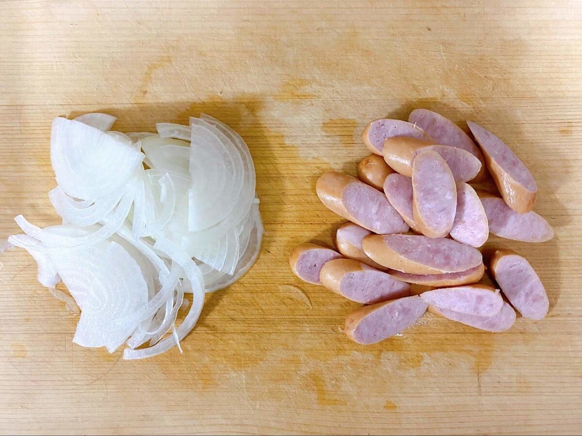 玉ねぎは薄切り、ソーセージはななめ切りにします。