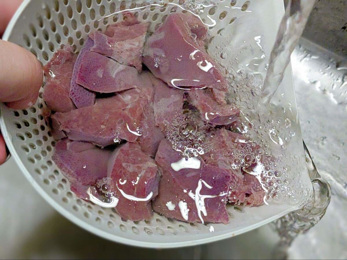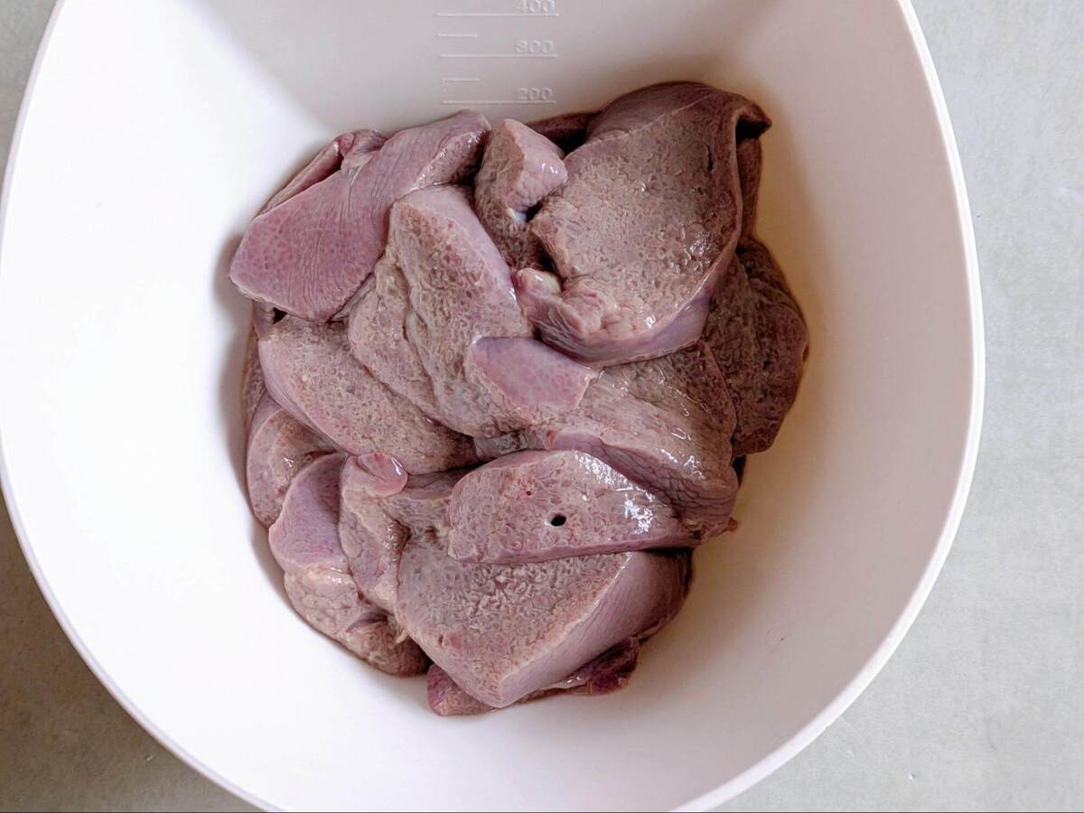 レバーはボウルに重ねたザルに入れ、水を加えて軽く揉みます。この水が透明になるまで数回繰り返してください。
